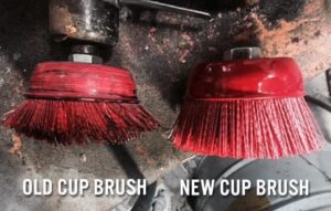 Your cup brush me be inspected for overuse and poor brush memory. If the the brush has poor memory (flattened out) and/or is not able to remove the topcoat easily, it should be replaced. Be sure to use a buffer/grinder with variable speed to spin the cup brush at 1500 rpm or less. This keeps the bristles from flaring straight out and ruining the brush.